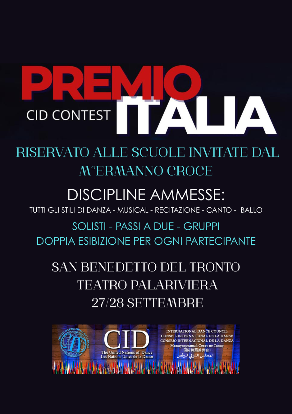 I migliori talenti di danza, canto e musical si incontrano a San Benedetto del Tronto, al Premio Italia CID Contest, in un appuntamento riservato alle scuole d'arte selezionate su tutto il territorio Italiano. Ogni partecipante ha la possibilità di esibirsi due volte, in modo da potersi proporre alla qualificata Commissione giudicante, in due diversi momenti del Contest. Questa esigenza nasce dall'importanza delle Borse di Studio che verranno assegnate, per altrettanti appuntamenti formativi, quali: